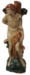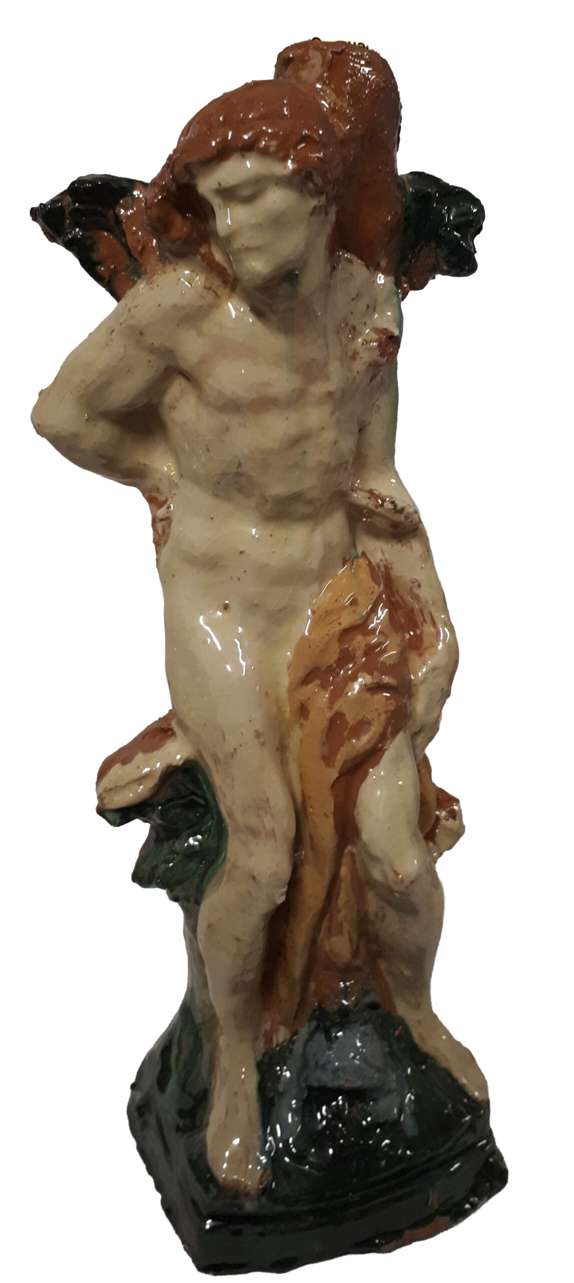 Diese dekorative Keramikfigur des heiligen Sebastian ist ein Ausdruck der traditionellen Töpferkunst. Die historische und originale Gießform für Steinzeug der Töpferei Plein aus der Eifel wurde hier für Irdenware verwendet. Die farbige Fassung erfolgte mit traditionellen Engoben in der Tradition des Niederrheins. Nach dem Schrühbrand wurde die Keramikfigur im zweiten Brand mit einer lebensmittelachten Glasur versiegelt.